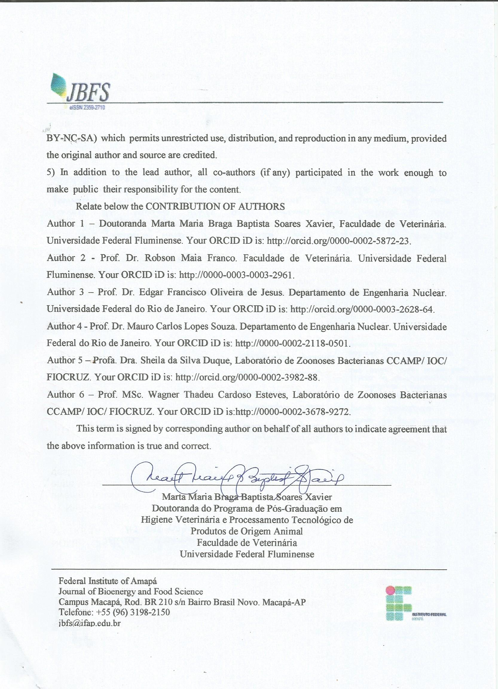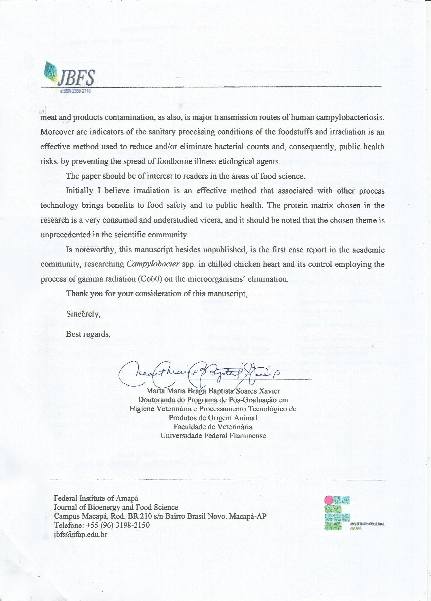 XAVIER, M. M. B. B. S.; FRANCO, R. M.; FONSECA, A. B. M.; JESUS, E. F. O.; SOUZA, M. C. L.; DUQUE, S. S.; ESTEVES, W. T. Effect of gamma irradiation (Co60) in the control of Campylobacter sp. in chilled chicken (Gallus gallus) heart. African Journal of Microbiology Research. v. 10, n. 38, p. out 2016.