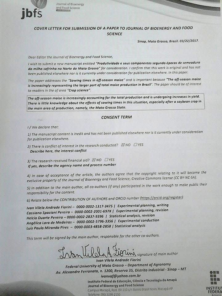 Silva, A. G., Duarte, A. P., Piedade, R. C., Costa, H. P., Meireles, K. G. C., & Borges, L. P. (2015) Inoculação de sementes de milho safrinha com Azospirillum e aplicação de nitrogênio em cobertura. Revista Brasileira de Milho e Sorgo, 14(3), 358-370. 10.18512/1980-6477